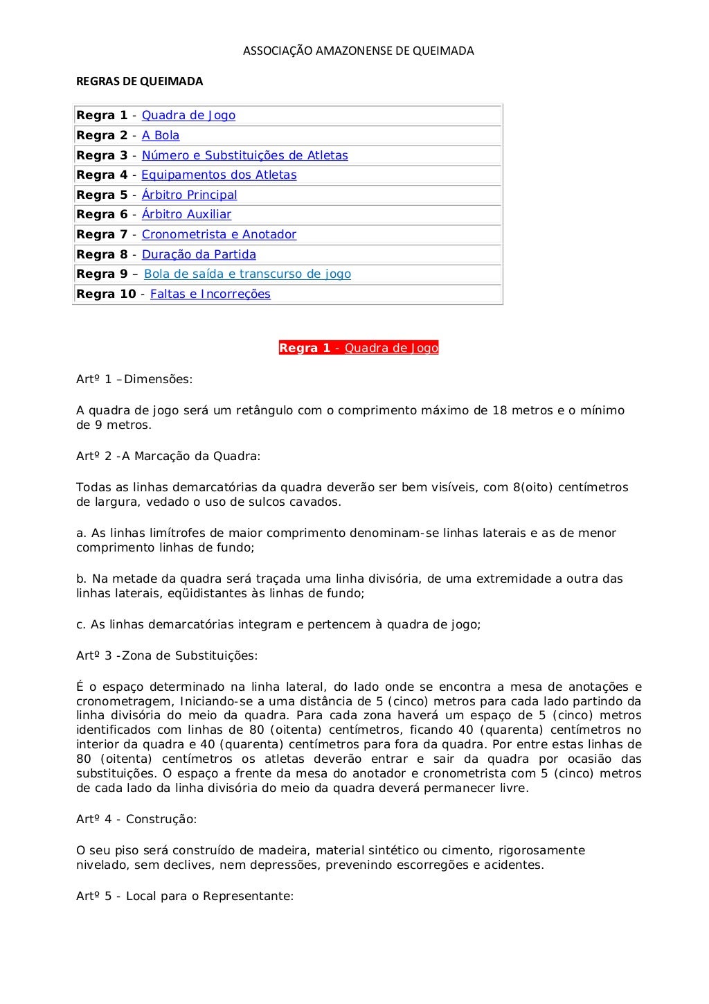 Webquer saber quais são as regras da queimada para jogar com seus amigos? No umcomo explicamos como funciona o jogo e como os times devem se. Webexplicação das regras básicas da queimada, incluindo formação das equipes, delimitação do campo, posição inicial dos jogadores e objetivo do jogo. As regras da brincadeira queimada não são unificadas no brasil, variando conforme a região.