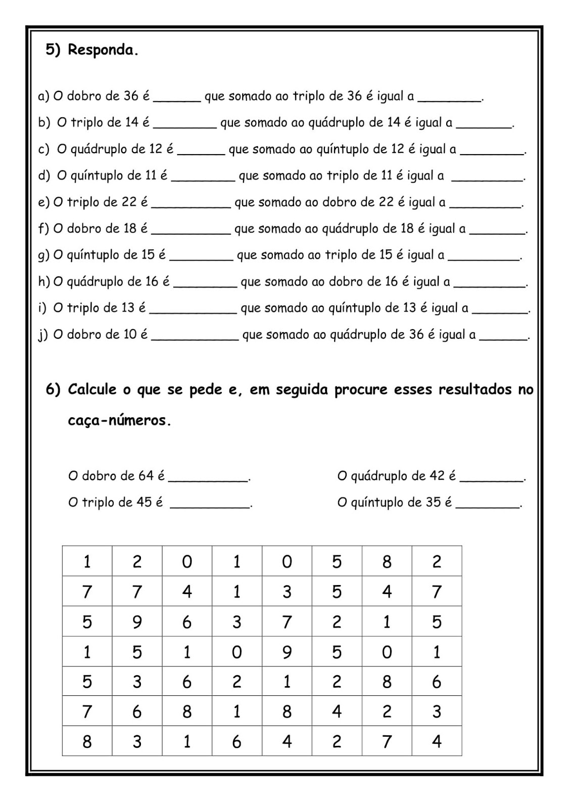 Webum site de atividades gratuitas e formativas para todas as disciplinas visando fortalecer o trabalho dos professores em sala de aula. Atividade de matemática que permite trabalhar exercícios de dobro, triplo, quádruplo e quíntuplo, pronta para imprimir e usar. Atividade com dobro e triplo em pdf.