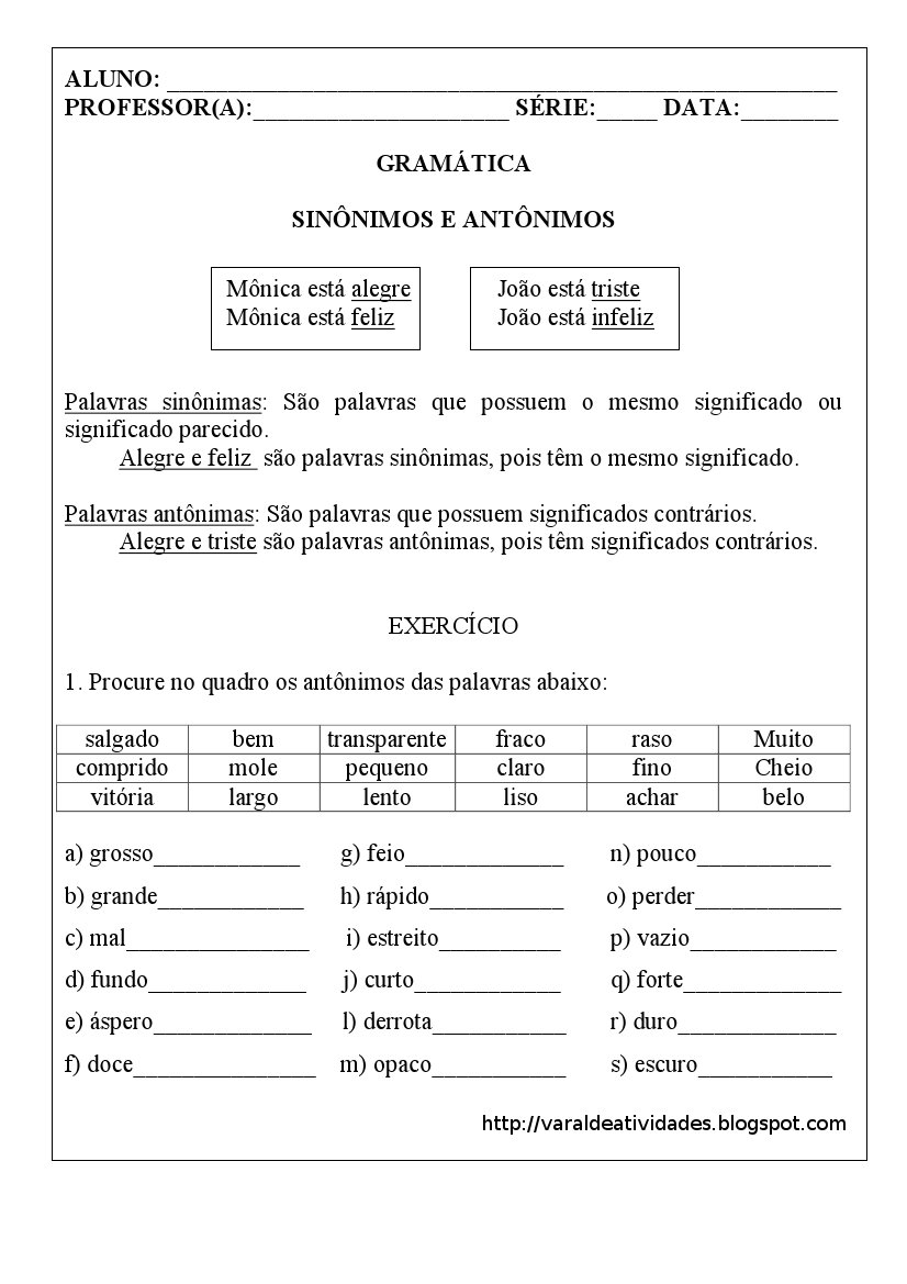Elas não são sinônimos e sim antônimos das palavras em destaque. Webatividade de língua portuguesa sobre sinônimos para o 6º ano, 7º ano,. Websinônimos são palavras que têm sentido igual ou muito parecido, enquanto antônimos são palavras que têm sentido contrário. Belo e bonito casa e. Webselecionamos nesta postagem diversas atividades com sinônimos e antônimos para copiar e ou imprimir.