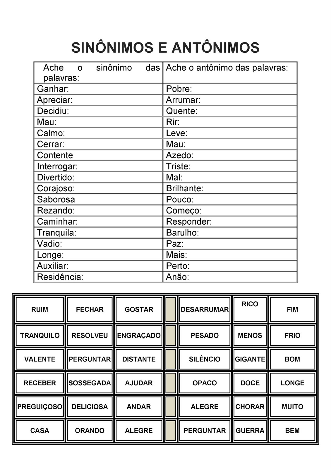 Compreender e utilizar corretamente esses conceitos é fundamental para. Webconfira as atividades de sinônimos e antônimos para o 2. º ano do ensino fundamental. As atividades são variadas (reescrever frases, ligar, achar, pintar e criar frases) e incluem as respectivas folhas de respostas. Reescreva frases da música rato com. Webatividade de português, indicada para alunos do quarto ou quinto ano do ensino fundamental, com exercícios de sinônimos. Você pode baixar esta atividade de língua. Webatividades e ideias para abrilhantar ainda mais a sua prática pedagógica! Hoje trago para vocês um super jogo para seus alunos. Websaber utilizar palavras de forma correta e variada é essencial para enriquecer a comunicação e exprimir ideias com clareza. Nesta publicação, o site tudo sala de aula.