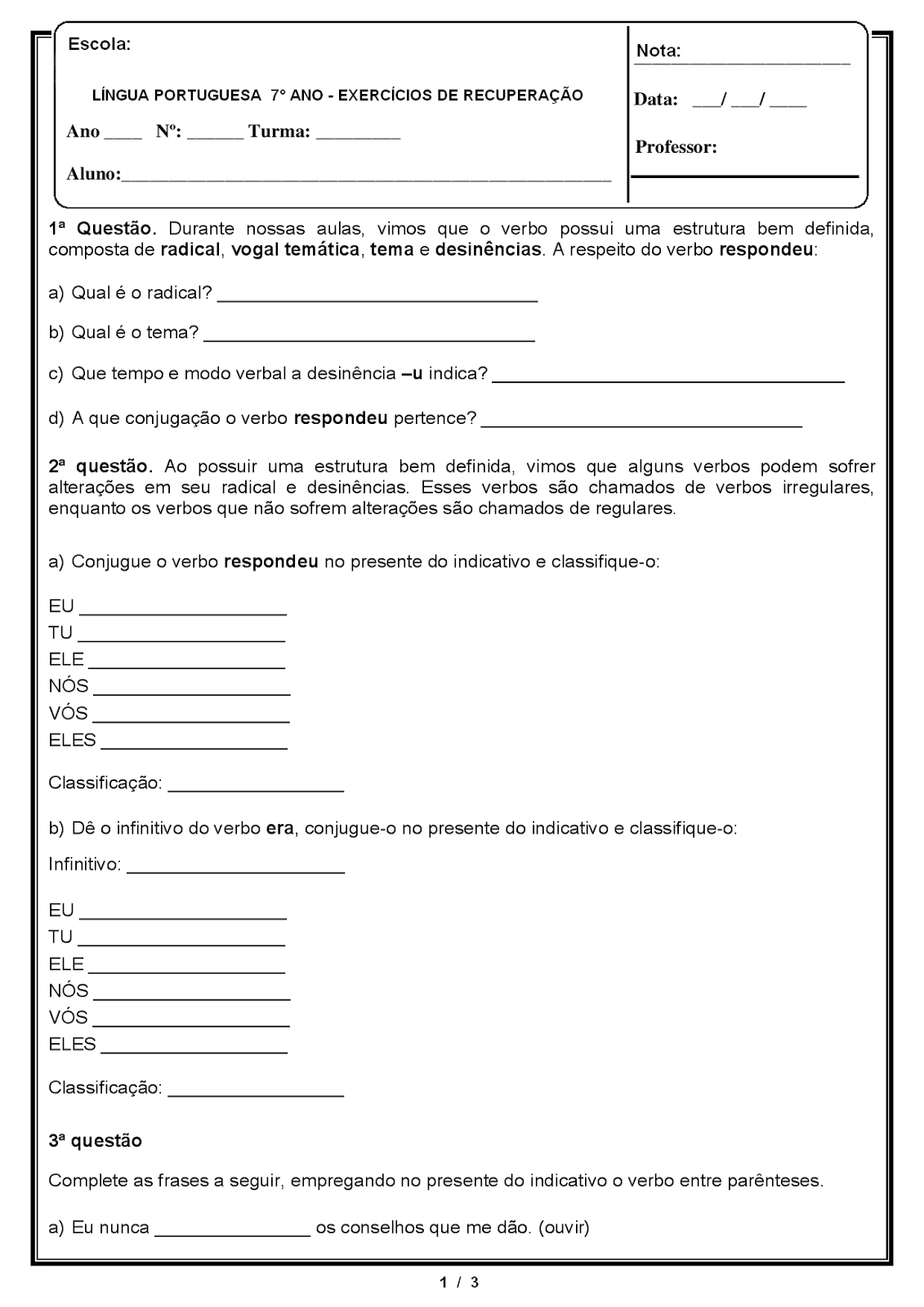 Atividades Sobre Estrutura Do Verbo Radical Vogal Tematica E Desinencia