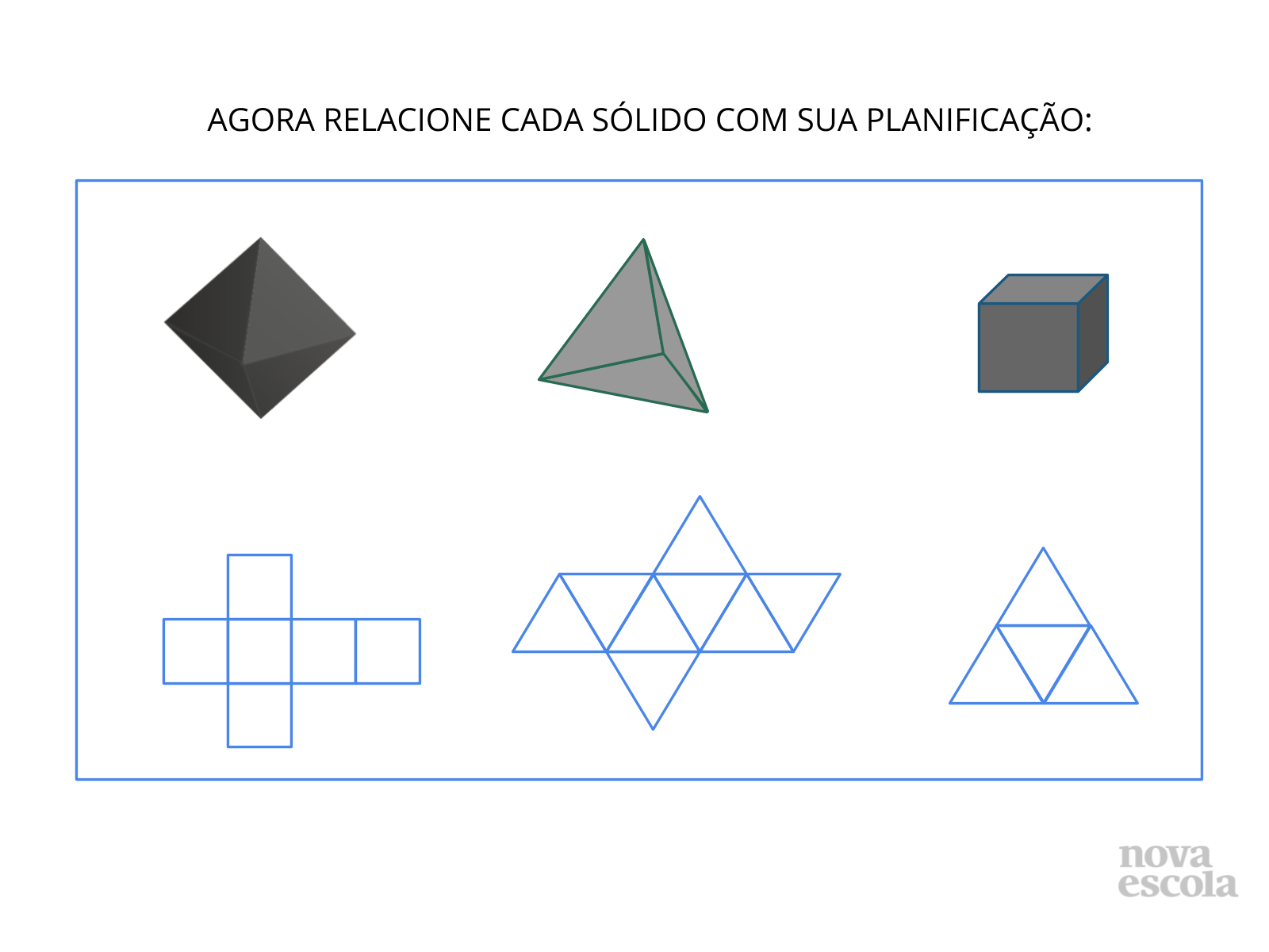 Esse processo é também conhecido como d e s d o b r a m e n t o de poliedros. Como podemos fazer essa planificação? 1 ) identifique todas as faces do poliedro. Webos nomes dos sólidos geométricos que podem ser montados com cada um das planificações são: A) pirâmide de base quadrangular;