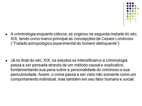 No entanto, poucos criminólogos analisam o discurso lombrosiano sobre a criminalidade feminina, presente no livro a mulher criminosa, a prostituta e a mulher normal. Em 12x r$ 3, 09. Ver os meios de pagamento. O que você precisa saber sobre este produto. Webcesare lombroso, um médico italiano, criminólogo, evidenciou seus estudos com intuito de identificar criminosos por meios de aspectos genéticos, físicos e estéticos. Em 1876 a sua principal obra “o homem delinquente”, teve uma enorme popularidade dentro do grupo que acompanhava os estudos do fenômeno criminológico. Cesare lombroso foi um criminologista e médico italiano do século xix que se tornou famoso por seus estudos sobre a natureza do crime e dos criminosos. Lombroso é conhecido por ter desenvolvido a teoria do criminoso nato, que afirmava que algumas pessoas nascem com características biológicas que os predisporiam ao crime. Webquando o médico italiano cesar lombroso publicou, em 1876, seu “tratado antropológico e experimental do homem delinquente”, que mais tarde se tornaria no livro internacionalmente conhecido como “o homem delinquente” talvez ele não tivesse o firme propósito de destruir o direito penal da sua época. Webo homem delinqüente / cesare lombroso ;