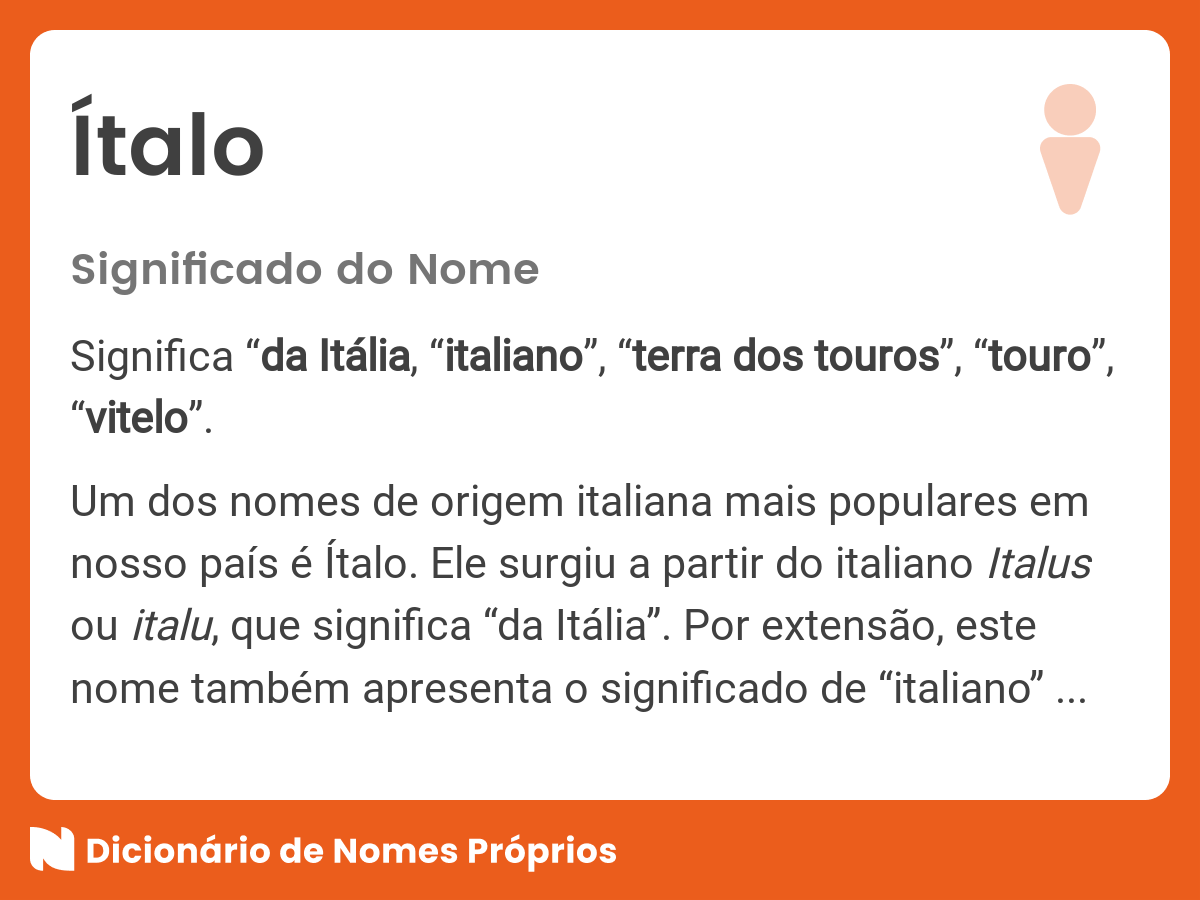 Pensando em dar o nome ítalo para seu bebê?. Webo nome ítalo é de origem grega e vem do termo italós, que significa “touro”, “vitelo”. Os principais historiadores acreditam que a etimologia do vocábulo ítalo tenha relação com. Ítalo tem 5 carácteres, origem do nome ítalo = latim. Pessoas com a primeira letra do nome = i. Fiel, carinhoso e de muita. Webítalo é um nome de origem latina, derivado da palavra «italicus». Os itálicos eram povos antigos que habitavam a península itálica, na região que hoje. Webo nome ítalo é um nome bastante popular no brasil, mas nem todos conhecem o seu verdadeiro significado. Como vimos, o nome tem origem na palavra “italia” e está.
